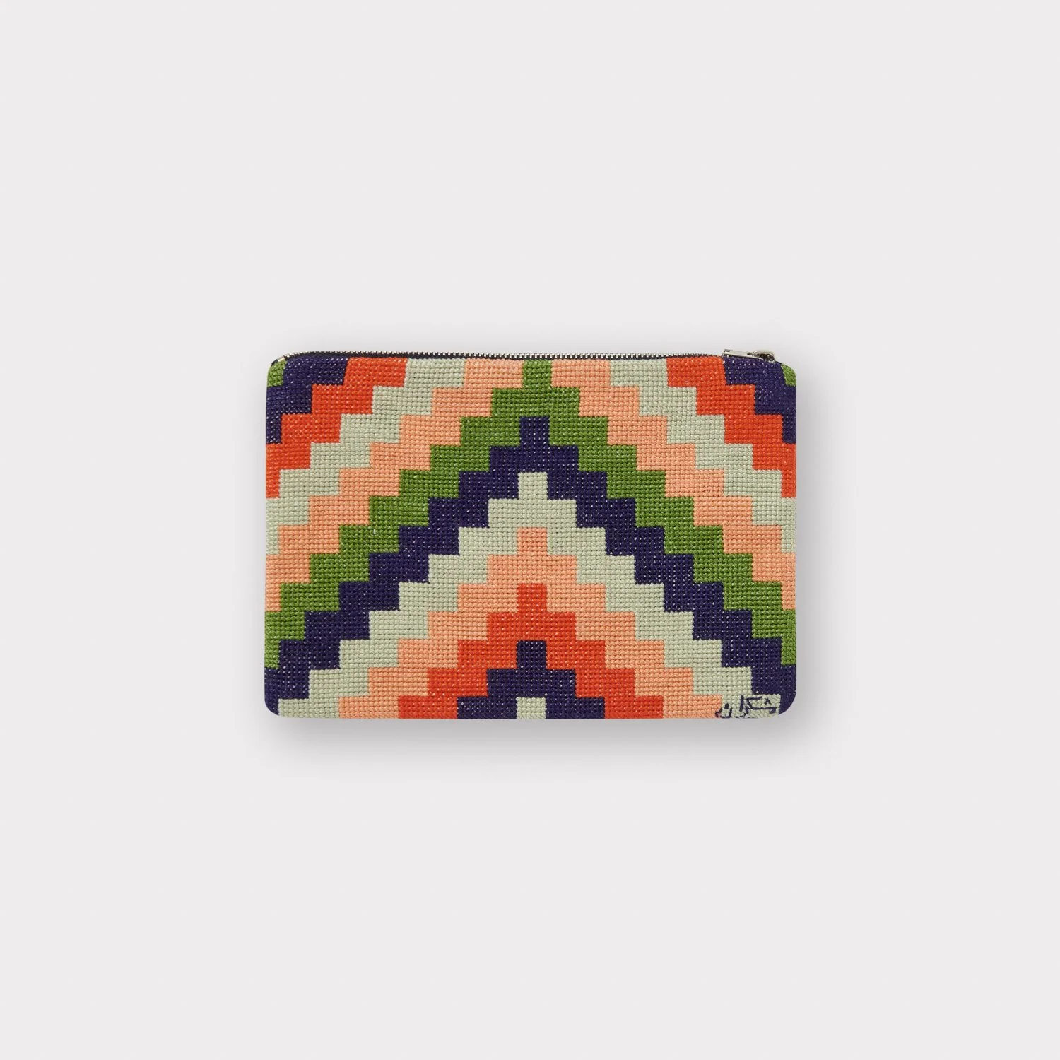 The Soraya compact clutch is fully hand-embroidered in cross stitch on both sides, forming a geometric zigzag pattern that feels rhythmic and grounded. Harmonious shades of pink and blue are punctuated with a gentle touch of green, creating a palette that is both soothing and confidently bold. The design is carefully balanced, drawing the eye without overwhelming, and showcasing the precision of the stitch work.