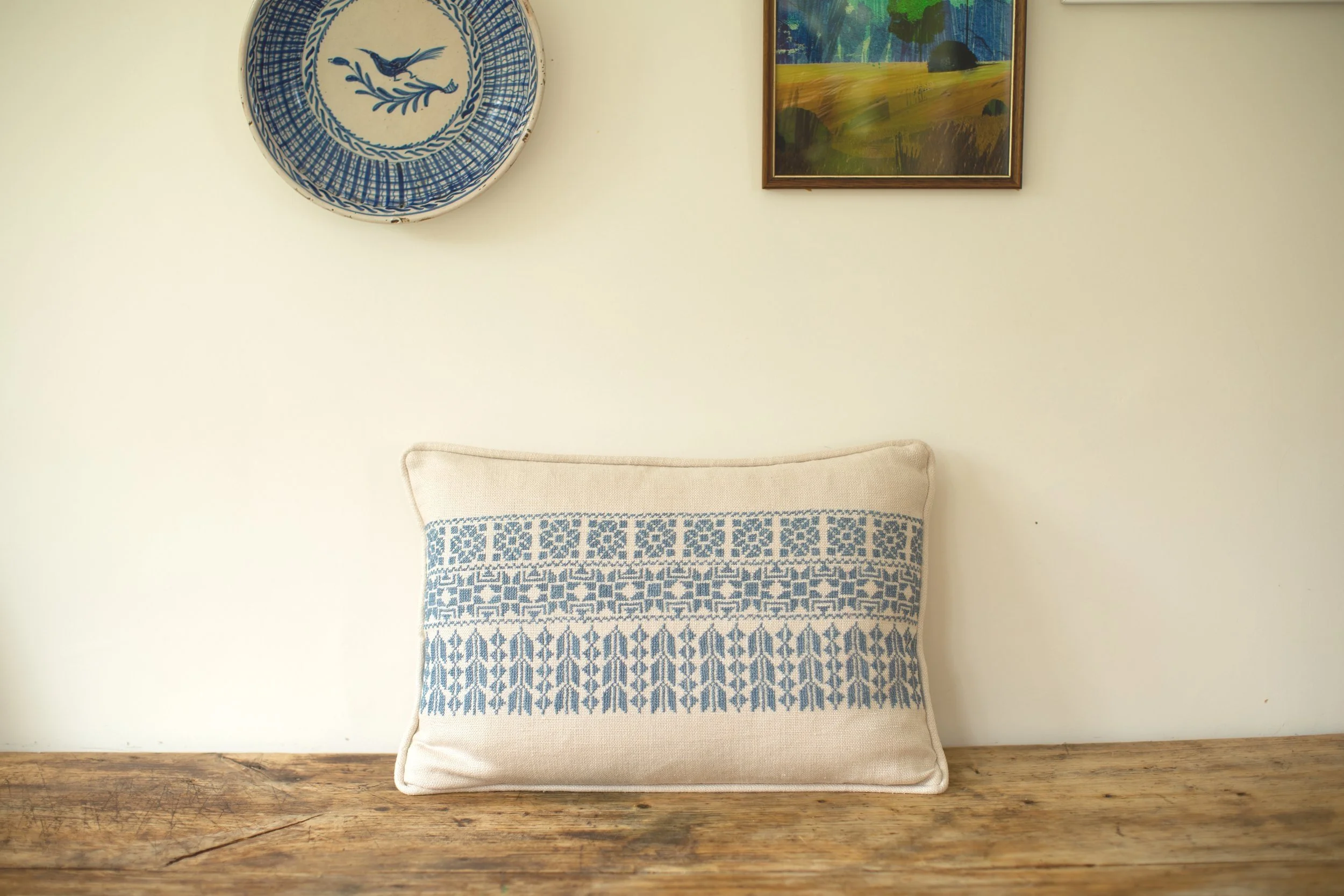 Like all of our work, this cushion is hand-embroidered by Syrian refugee women. This one is particularly intricately embroidered, and takes weeks to complete. It provides a family with rent, food and school fees for a whole month.